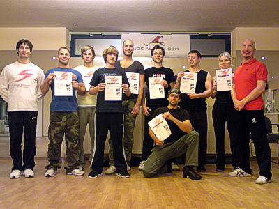 Die meisten Teilnehmer besuchten sogar mehr als einen dieser Kurse, da die Terminlegung dieser Veranstaltungen dieses Jahr relativ kompakt war. Das erste mal fand unter der Leitung von Marko Milutinovic (Gründungsmitglied der Academy) der Workshop "Filmakrobatik" statt, bei dem die Teilnehmer nicht nur vor, sondern auch hinter der Kamera stehen mussten. Videoimpression dieses Workshops folgen in Kürze. Die nächsten Termine für das Frühjahr 2011 stehen auch schon fest (siehe News). An dieser Stelle wünschen wir allen Stuntfightinginteressierten ein frohes Fest und einen guten Rutsch ins neue Jahr. ![]() v.l.n.r. Marko Milutinovic, Teilnehmer, Joe Alexander Filmakrobatik-Workshop |